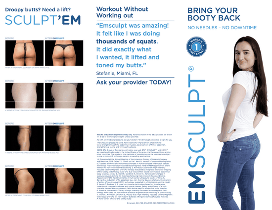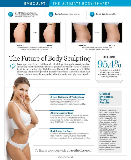The EMSCULPT is the only procedure to help both women and men build muscle and sculpt their body. In addition, the EMSCULPT creates the world's first non-invasive buttock toning procedureThe non-invasive HIFEM® procedure induces powerful muscle contractions not achievable through voluntary contractions. When exposed to strong contractions, the muscle tissue is forced to adapt to such extreme condition. It responds with a deep remodeling of its inner structure that results in muscle building and sculpting your body.